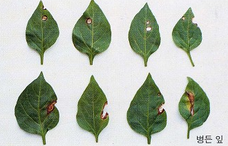 ◦ 잎의 가장자리로부터 병반이 형성된 경우에는 대부분 병반의 내부가 탈락하여 없어짐