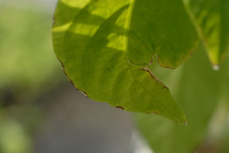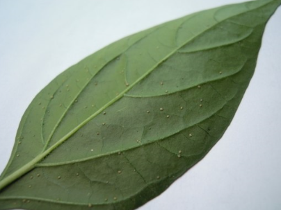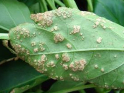 ◦ 기부에서 전염된 잎에서는 수포와 같이 돌출된 작은 흰색 반점으로 나타나고 잎 뒷면에는 반점이 돌출되어 더뎅이를 형성하며, 도관으로 감염된 잎에서는 잎끝이 마르는 증상으로 나타남