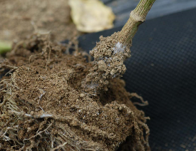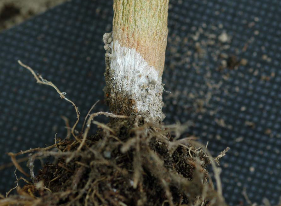 ◦ 경우에 따라서는 곰팡이가 줄기 밑동에서 시작하여 주변의 흙과 동떨어진 잎 등 유기물에도 옮아 붙어 있는 것을 볼 수 있음