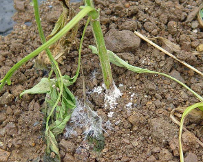 ◦ 시들어 말라 죽는 것은 역병과 비슷하나 줄기 밑동을 보면 약간 잘록해지면서 그 아래 솜털 모양으로 회백색 곰팡이가 피어있는 것을 볼 수 있으며, 뽑아보면 뿌리에도 흰 곰팡이가 피어있는 것을 볼 수 있음