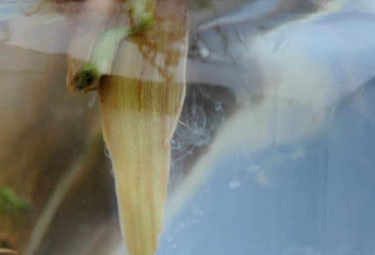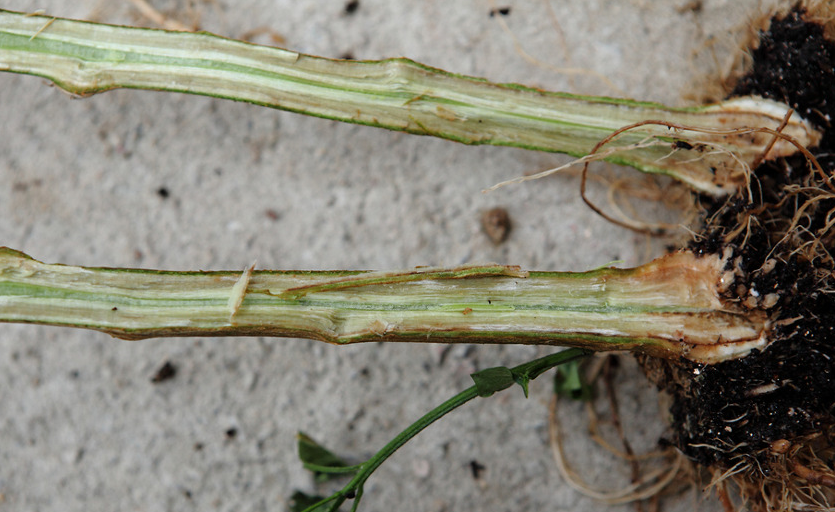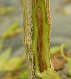 ◦ 줄기 내부는 갈색으로 변하며, 줄기를 잘라 물에 담가 보면 하얀 우유빛의 세균액이 분출됨