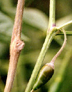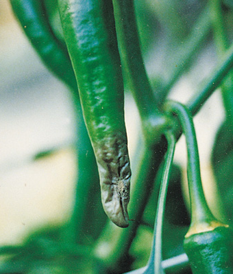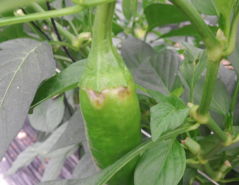 ◦ 과실에서는 풋고추의 꽃이 달린 부위에서부터 회색으로 물러 썩고 진전되면 과실의 안쪽으로 썩어 올라가며, 후에 잿빛의 곰팡이가 많이 형성됨