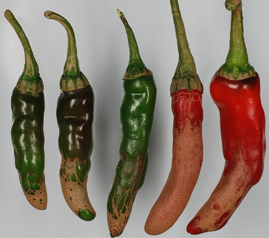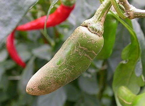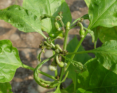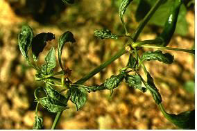 ◦ 초기에는 생장점 부위의 어린잎에 주름이 생기고 잎 가장자리가 안쪽으로 오그라들고 기형이 되며, 이때 잎 뒷면은 마치 기름을 바른 것처럼 광택이 나고 갈색이 짙어지며, 심하면 생장점 부근의 잎이 말라 떨어짐