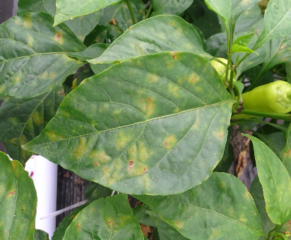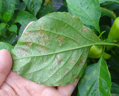 ◦ 밀도가 낮은 시기에는 순 부위부터 가해하는데, 피해 받은 새순의 경우 흡즙 당한 부위에 갈색 반점이 나타나고 점차 자라면서 뒤틀린 기형의 잎이 생기며, 밀도가 높아지면 잎 뒷면을 가해하므로 잎의 황화현상이 나타나고 심하면 잎 전체가 고사하기도 함