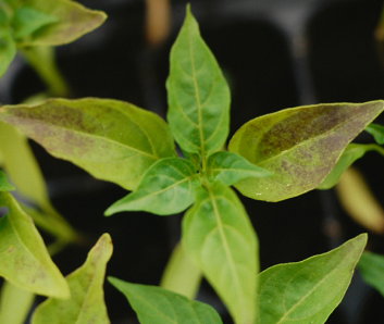 ◦ 심한 경우 새로운 잎의 크기가 작아지고 굳어지며, 농녹색을 띠고 늙은 잎의 잎맥과 잎맥 사이의 조직 양쪽에 큰 수침상의 반점이 생겼다가 갈색으로 변함