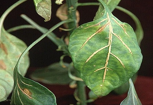 ◦ 생장점 부근의 잎의 황화가 잎맥과 관계가 없이 모자이크상으로 되면 바이러스일 가능성이 크고 동일 증상이라도 상위 엽이 건전하고 중위 엽에서 나타나는 경우면 다른 요소 결핍일 가능성이 큼