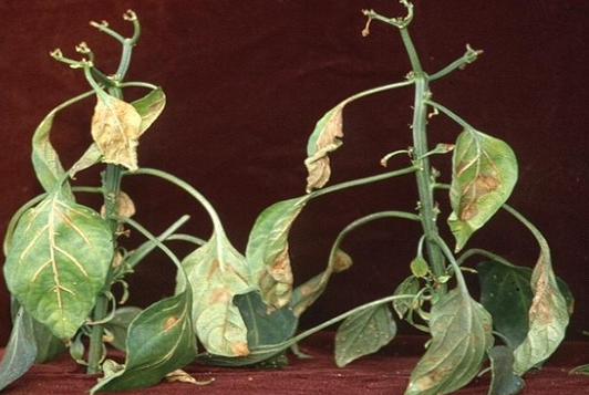 ◦ 잎맥이 갈변하는 뚜렷한 증상을 보이며, 잎이 황화되기 시작하고 갈색 반점이 발생함
