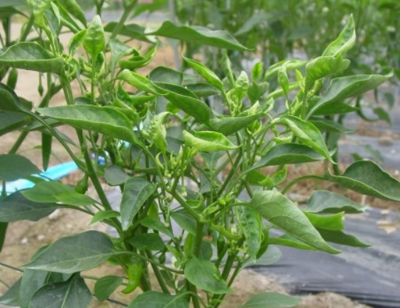 ◦ 선단부에 가까운 어린 잎의 가장자리부터 황화되기 시작해 안쪽으로 퍼져 나오며, 상위 엽이 약간 소형으로 되면서 외측 또는 내측으로 비틀어짐