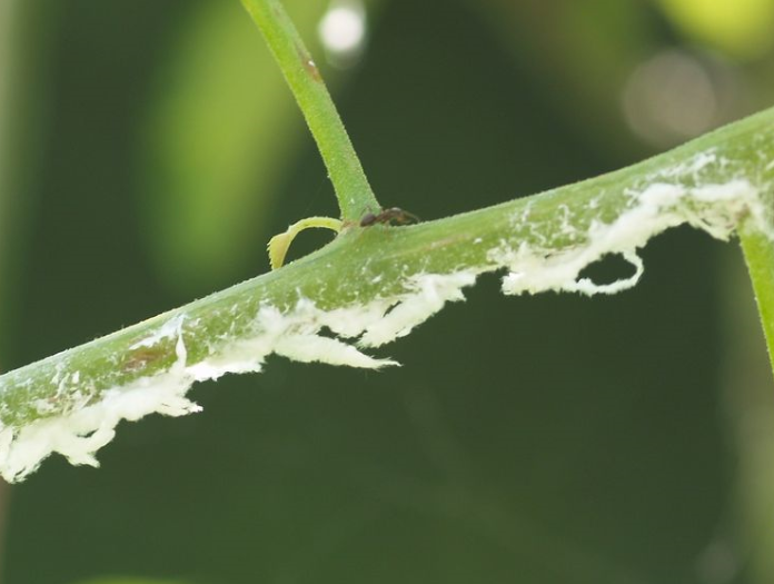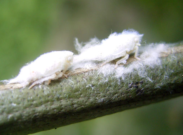 ◦ 약충이 5~7월경 가지에 기생하여 흰 솜과 같은 물질을 분비하며, 약충과 성충의 흡즙에 의한 피해는 문제가 되지 않으나 약충의 분비물과 탈피각이 장기간 가지나 잎에 붙어 있어 피해를 일으킴