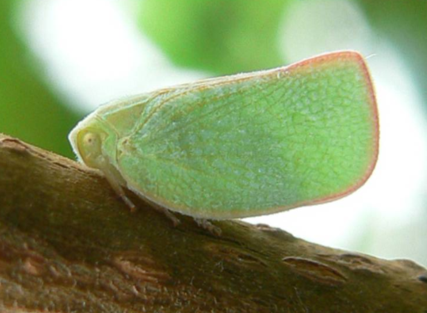 ◦ 성충은 5mm이며, 날개는 전체 길이가 10mm로 비교적 길며, 앞날개는 녹색이고 뒷날개는 녹색을 띤 백색으로 보통 날개를 세로 방향으로 정지하고 있어 측면에서 보면 삼각형으로 보임