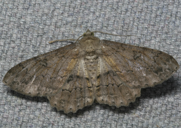 ◦ 성충의 앞날개 길이는 약 39mm로 몸빛깔은 황갈색이나 개체에 따라 색채가 짙고 엷은 것이 있으며, 날개는 회색으로 암갈색 점이 산재해 있음