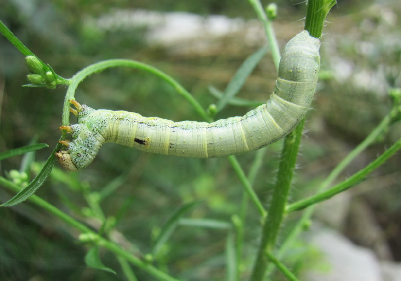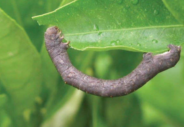 ◦ 유충이 특유의 자벌레 운동을 하면서 잎을 식해하는데, 노숙유충은 여러 잎을 거의 엽맥만 남기고 폭식함