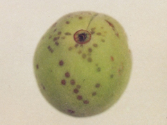 ◦ 과일에서는 처음 작은 반점이 생기고 점차 커져서 직경이 2~10mm에 달하고 형태가 다양해지며, 색깔은 적갈색을 띠고 심한 경우에는 병반 표면이 거칠게 갈라짐