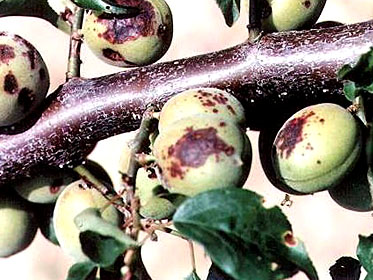 ◦ 가지, 잎, 과실, 꽃 등 지상부의 모든 부분에서 발생하며, 가장 피해가 심한 부분은 과일이나 월동한 어린 가지임
