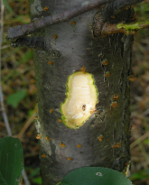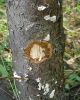 ◦ 피해를 받은 줄기의 껍질을 벗겨보면 조직이 괴사한 것을 관찰 할 수 있음