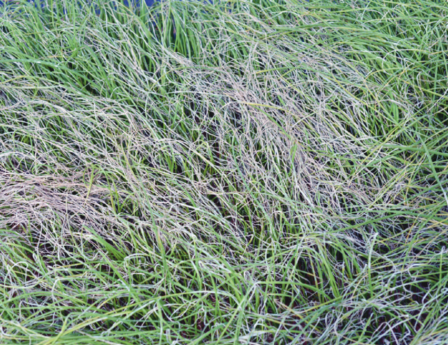 ◦ 초기에는 흰색의 작은 점무늬로 시작하고 잎 끝부분부터 마르기 시작하여 점차 아래쪽으로 진전됨