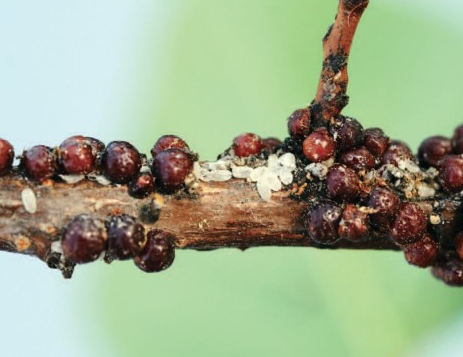 ◦ 발생이 심하였던 포장은 이른 봄 새순이 생기기 전에 기계계유유제 등을 사용하여 월동밀도를 낮추어 주며, 등록된 약제가 없으므로 뽕나무깍지벌레 약제를 준용함