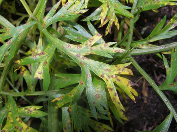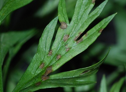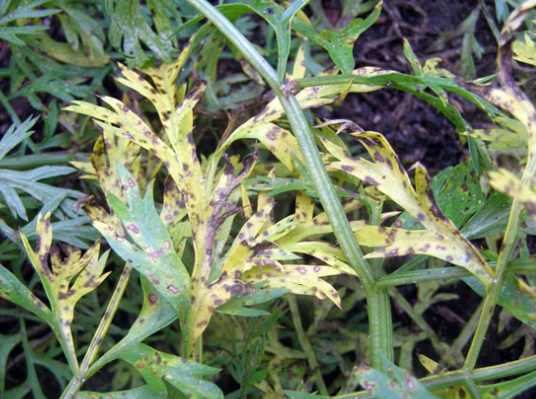 ◦ 잎자루에서는 긴 타원형 내지 방추형의 암갈색 반점을 형성하고 병이 심하게 걸린 그루는 아래쪽 잎부터 황색으로 변하면서 잘 떨어지기도 함
