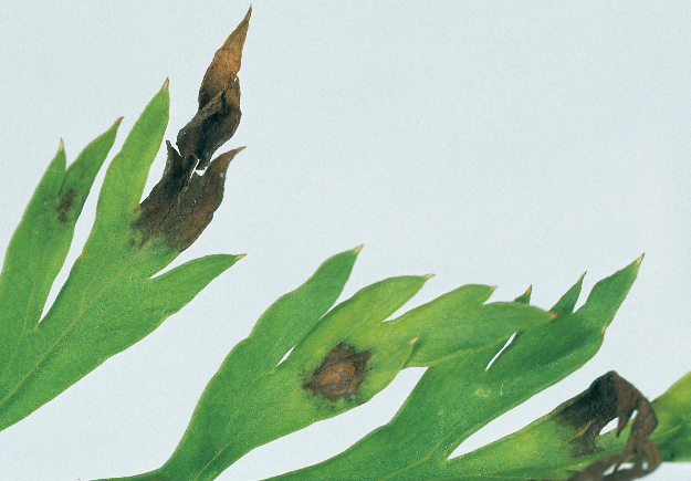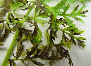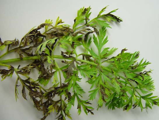 ◦ 잎에 처음에는 갈색 내지 암갈색의 부정형 작은 반점으로 나타나고 진전되면 병반들이 융합하여 커지며, 후에 감염된 잎은 암갈색 내지 흑색으로 변하며 말라 죽음