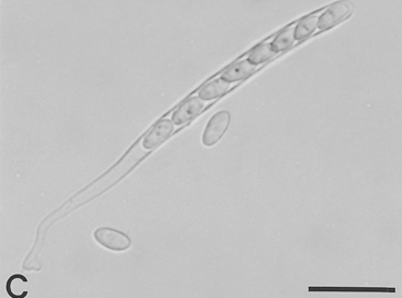 ◦ 자낭균에 속하며, 균핵은 흑색, 부정형, 크기 1.2~13.5×1~6.3mm, 자낭은 곤봉형 내지 원통형, 단일막, 크기 120~200×8~11㎛, 자낭포자는 무색, 단세포, 타원형, 크기 10~18×5~8㎛임