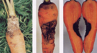 ◦ 뿌리의 한쪽에 궤양증상을 일으키는데, 연한 갈색 혹은 검은색으로 썩고 불에 데인 것처럼 보이기도 함