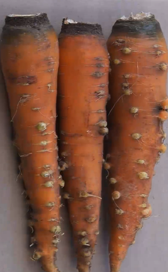 ◦ 당근 표면의 뿌리 흔적이 외부로 돌출되어 오돌토돌해지고 코르크 조직이 형성되는 현상으로 초세가 왕성한 품종일수록 많이 발생함