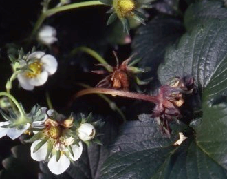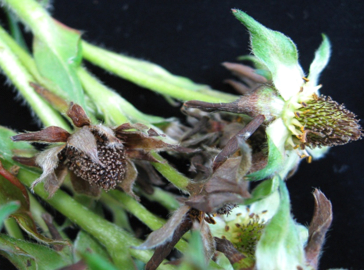 ◦ 딸기 꽃의 암술머리에 회색의 곰팡이가 피고 심해지면 꽃받침가지 전체가 흑변하여 마르는 증상을 나타내며, 기형과를 유발하는 피해를 입힘