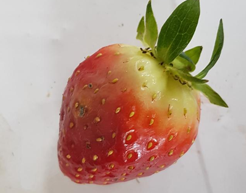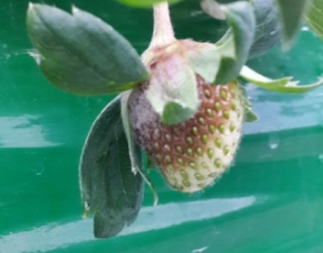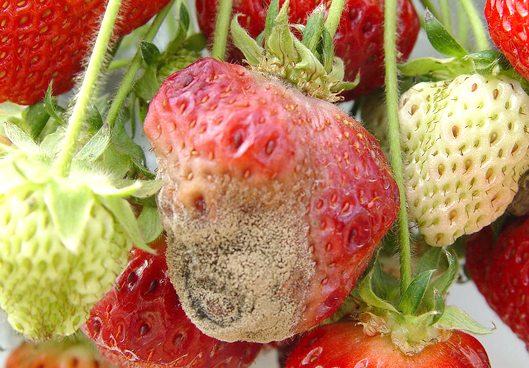 ◦ 과실에는 작은 수침상의 담갈색 병반으로 나타나고 점차 진전되면 과실이 부패하며, 부패된 과실에는 잿빛의 분생포자로 뒤덮힘
