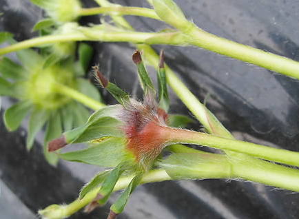 ◦ 과병과 잎자루에는 암갈색 병반이 형성되고 진전되면 줄기가 말라 죽으며, 잿빛의 곰팡이가 밀생함