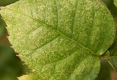 ◦ 잎 뒷면에서 세포 내용물을 빨아 먹어 잎 표면에 작은 흰 반점이 무더기로 나타나고 진전되면 잎이 갈색으로 변하면서 말라죽고 조기 낙엽됨