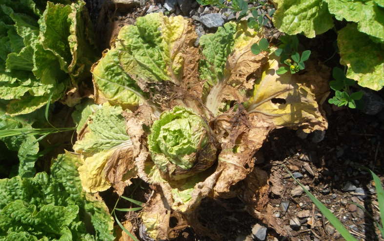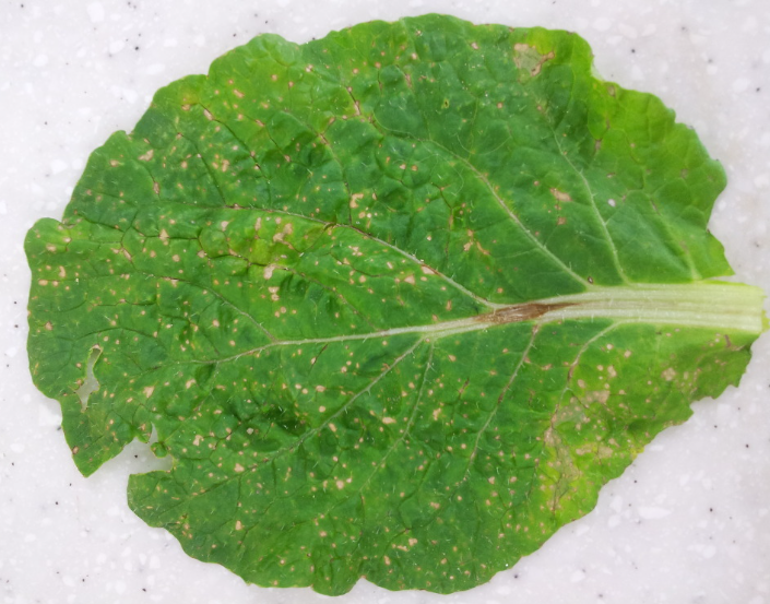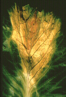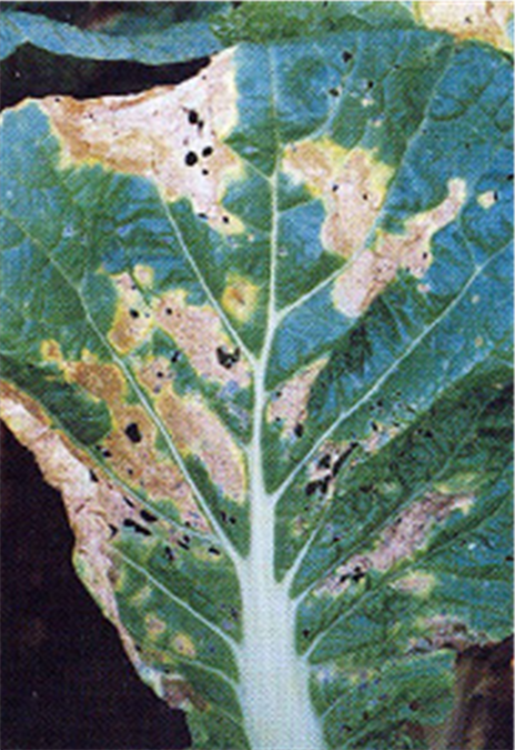◦ 진전되면 담황색 부정형 반점으로 나타나고 잎의 아래쪽으로 진전되면서 잎이 흑황색 내지 흑색으로 변하면서 마르며, 심하게 감염된 잎은 전체적으로 말라 죽음