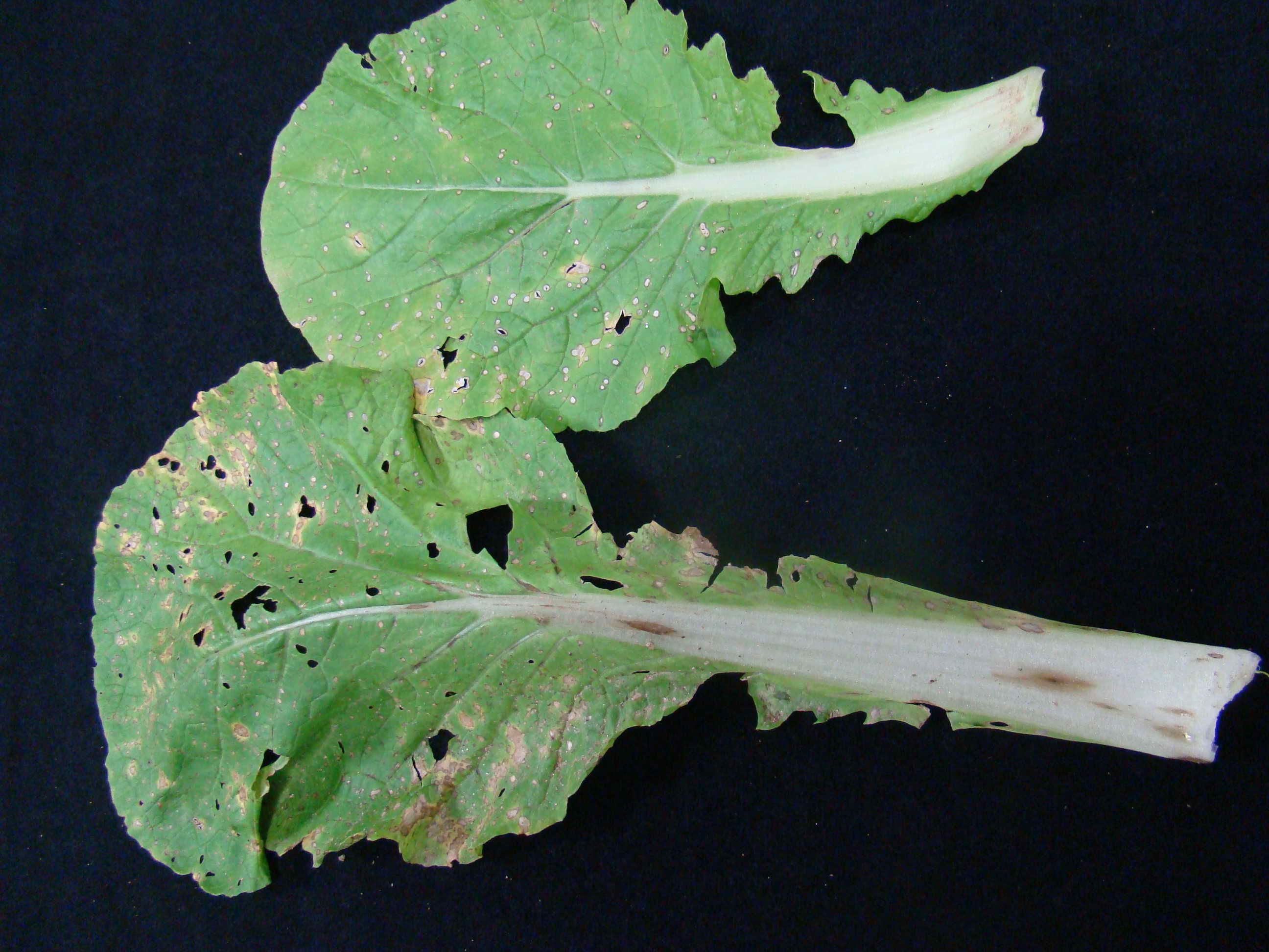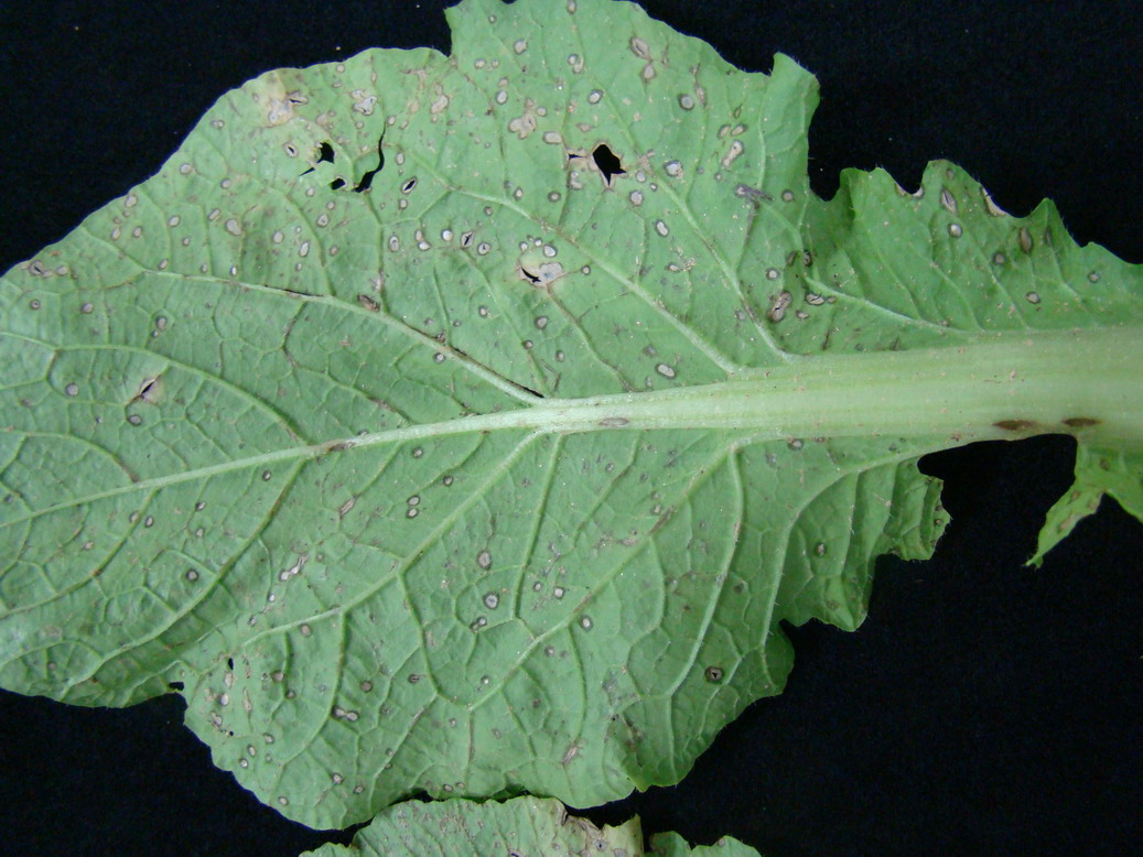 ◦ 잎에서는 처음에 흰색의 원형 내지 타원형 반점으로 나타나고 진전되면 병반이 부정형으로 확대되면서 병반의 내부는 회색 내지 회황색을 띠고 테두리는 흑색을 띠게 됨
