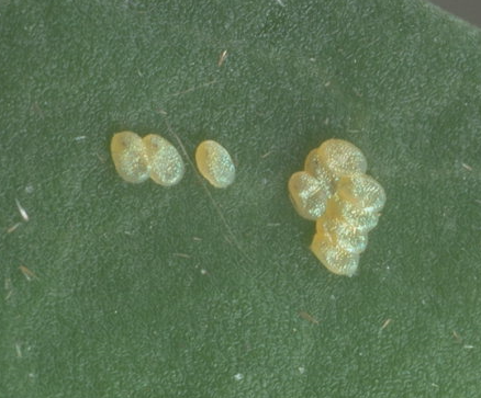 ◦ 성충은 주로 잎 뒷면의 엽맥부위에 1~3개씩 일생동안 100~200개의 알을 낳고 부화유충은 처음에는 엽육 내에 잠입하나 2령 이후에는 탈출하여 엽육을 식해하며, 3회 탈피 후에는 잎 뒷면의 엽맥 근처에 거친 그물모양의 고치를 만들고 그 속에서 번데기가 됨