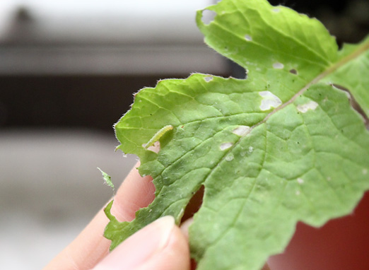 ◦ 알에서 갓 깨어난 어린벌레가 초기에는 엽육 속으로 파고 들어가 표피만 남기고 식해하다가 자라면서 잎 뒷면에서 식해하여 흰색의 표피를 남기며, 심하면 잎 전체를 식해하여 엽맥만 남음