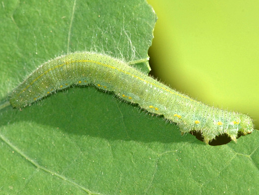 ◦ 노숙유충은 30mm 정도로 초록색이고 잔털이 많이 나 있으며, 숨구멍 주위에 검은 고리 무늬가 있고 숨구멍 선에는 노란점이 늘어서 있음