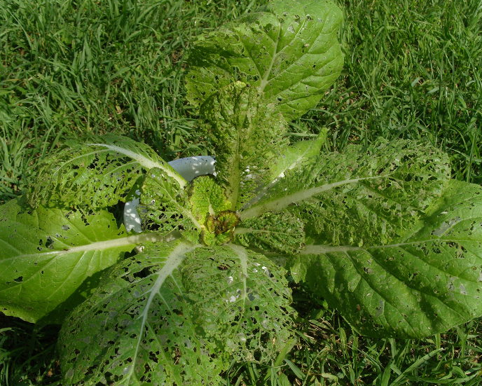 ◦ 알에서 갓 깨어난 어린벌레가 초기에는 엽육 속으로 파고 들어가 표피만 남기고 식해하다가 자라면서 잎 뒷면에서 식해하여 흰색의 표피를 남기며, 심하면 잎 전체를 식해하여 엽맥만 남음