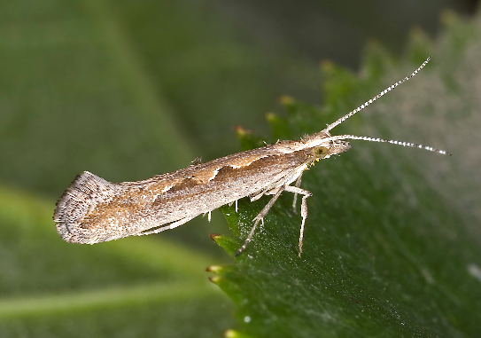 ◦ 성충은 약 6mm, 날개편길이는 12~15mm로서 몸은 갈색으로 가늘고 길며, 날개를 접었을 때 등면 중앙에 유황백색의 다이아몬드 무늬가 뚜렷함