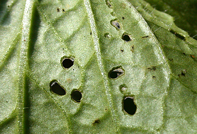 ◦ 작물의 어린 뿌리와 잎에 피해를 주어 작고 둥근 구멍을 뚫는데, 작물이 자람에 따라 구멍이 커짐