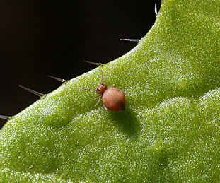 ◦ 성충의 몸길이 약 1.5mm로 가슴과 배가 서로 붙어서 둥근 모양을 이루고 더듬이에서 다리까지 암자색 또는 등황색의 크고 작은 반점이 있으며, 날개는 없고 작은 눈이 머리 양쪽에 8개씩 있음