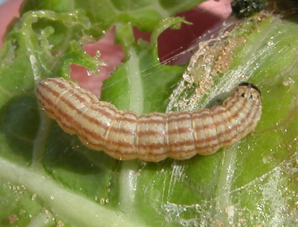 ◦ 4월에 제1회 성충이 발생하여 배추 순에 알을 낳으며, 부화한 유충은 잎표면을 기어다니며 갉아먹지만 2령부터는 잎을 실로 묶고 낮에는 실로 묶은 속에서 가해하고 밤에는 기어나와 갉아먹으며, 5령이 되면 실로 묶은 속에 들어있으면서 황색으로 변하여 번데기가 됨