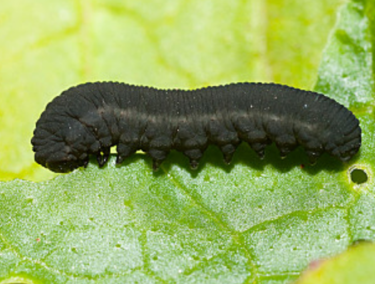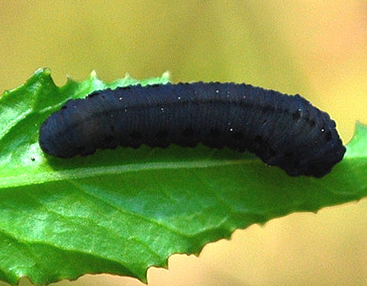 ◦ 유충이 잎을 갉아먹으며, 피해 흔적은 배추흰나비나 밤나방 유충과 비슷하지만 큰 잎줄기만을 남기고 가장자리부터 갉아먹는 점이 다름