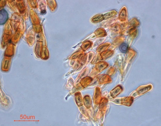 ◦ 담자균에 속하여, 동포자는 곤봉상의 장타원형, 담갈색, 2세포, 크기 40~60 ×15~20㎛, 하포자는 구형 또는 난형, 단세포, 크기 25~35×20~30㎛임