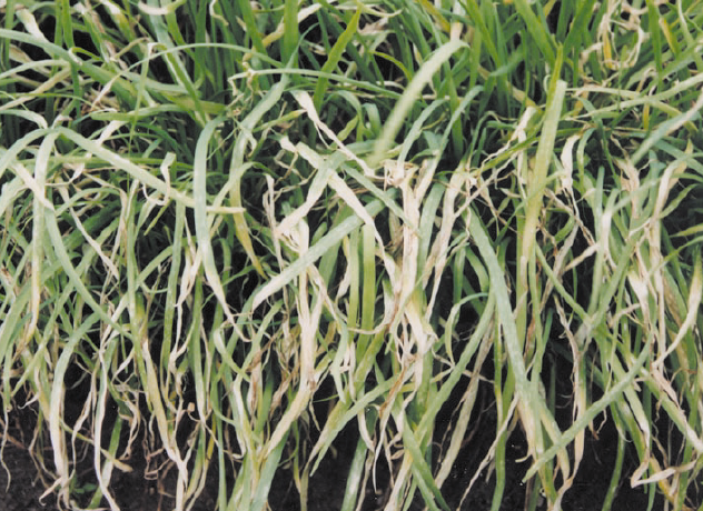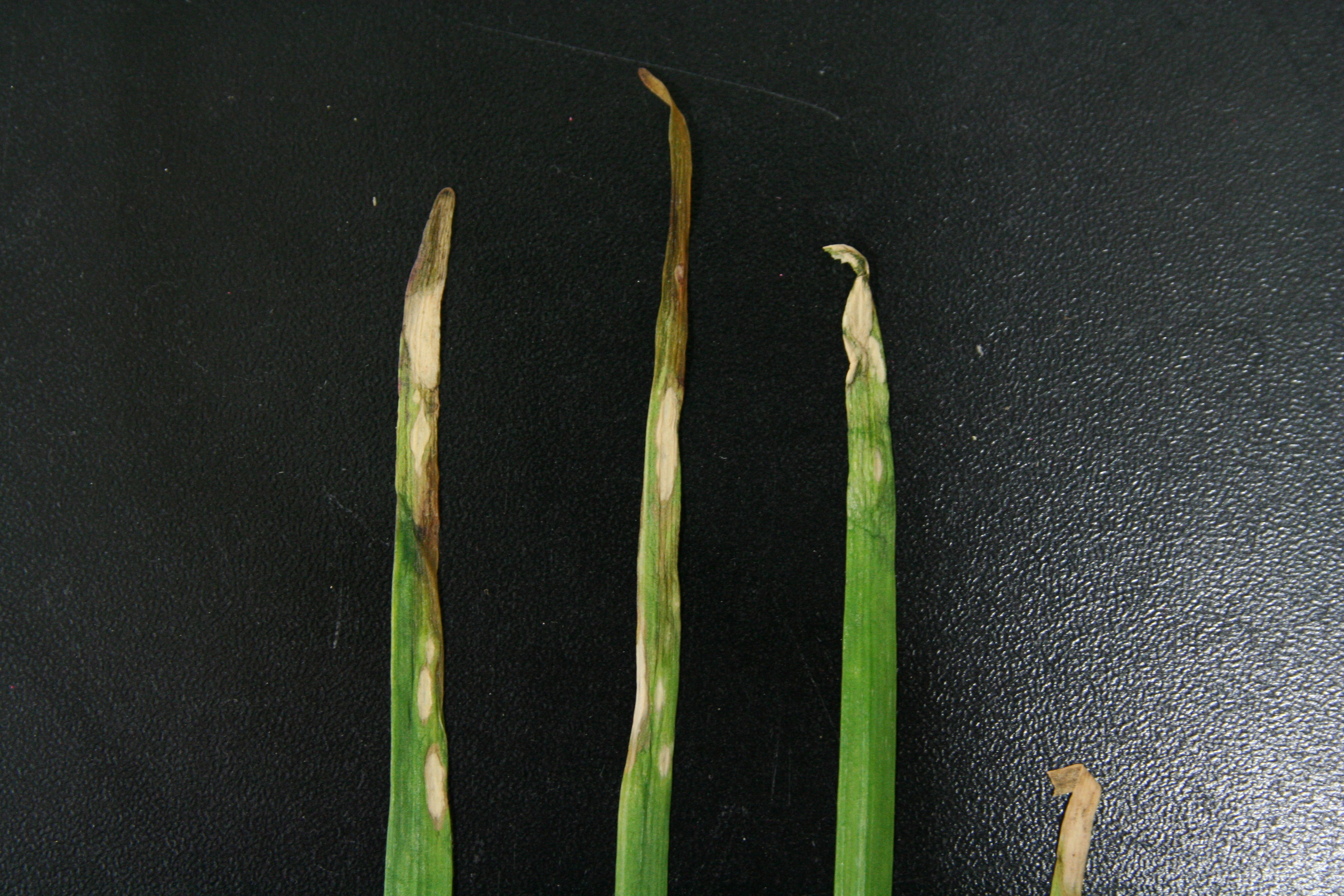 ◦ 부추잎 중간 부위에 원형 내지 타원형의 회백색 반점이 흩어져 형성되고 병반이 점차 커지면서 수확단계에 이르면 부추잎이 수침상으로 말라 죽음