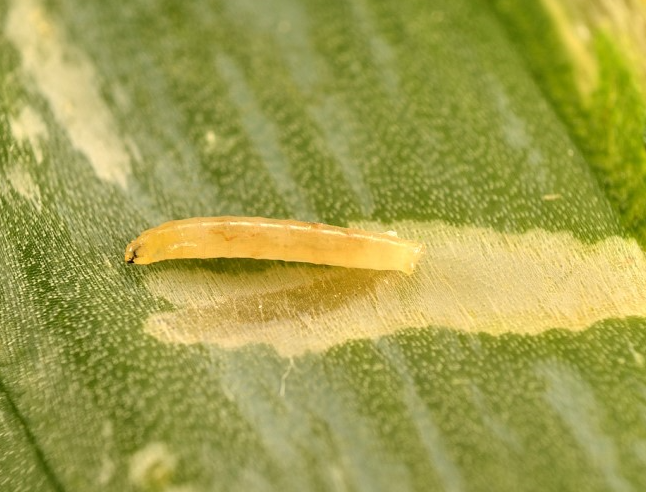 ◦ 유충이 잎 속에 굴을 파고 돌아다니면서 불규칙한 흰 줄 모양의 굴을 만들며, 피해를 받은 부분은 백색으로 변하고 까보면 유충을 쉽게 볼 수 있음