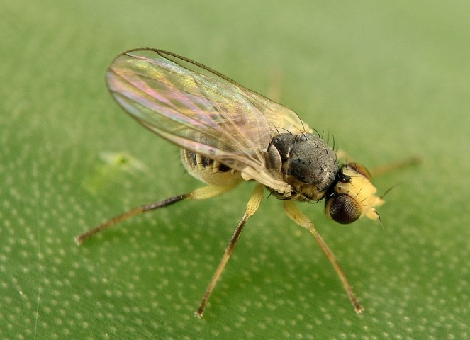 ◦ 성충은 2mm 정도로 회백색의 작은 파리로 몸 양옆면과 다리는 노란색이고 가슴과 배는 검은색임