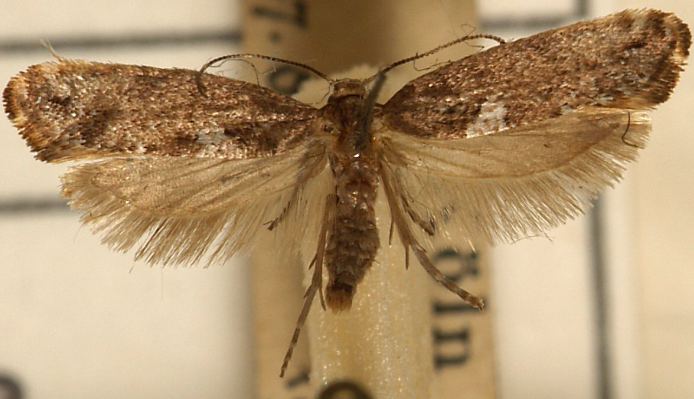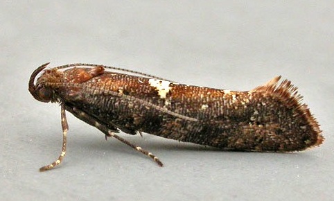 ◦ 성충은 몸길이 4.5mm, 날개편길이 9mm 정도이고 회흑색인 작은 나방으로 앞날개 뒷가장자리 중앙에 흰색 무늬가 1개 있고 날개를 접으면 등 중간에 큰 흰 무늬가 보임