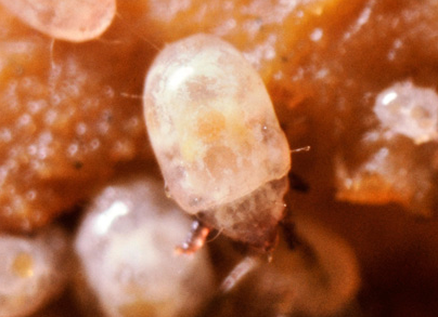 ◦ 응애는 좁쌀 모양 또는 서양배 모양으로 성충이 0.7mm 정도로 아주 작고 몸은 유백색이고 반투명하지만 다리와 턱은 암갈색을 띰