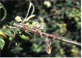 ◦ 가지는 주로 과실이 달린 꼭지부분의 줄기에서부터 발병되어 심하면 줄기 전체가 고사하는데 작은 가지에 많이 발생함
