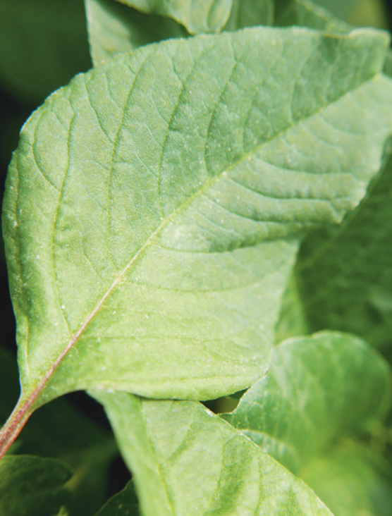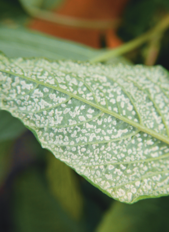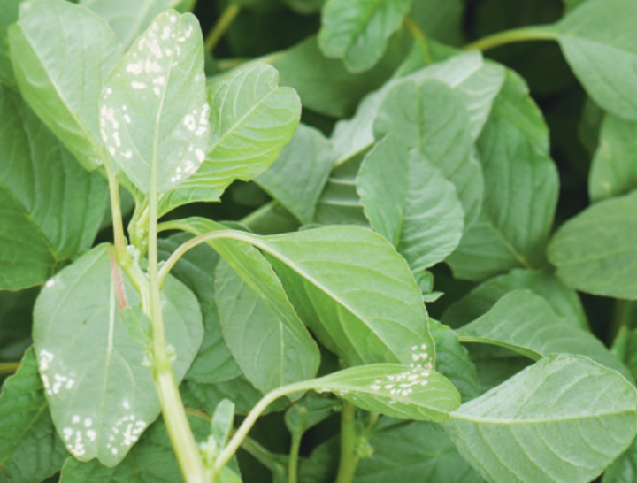 ◦ 병반의 잎 뒷면을 보면 흰색의 가루 더미가 부스럼처럼 돌출되어 있음