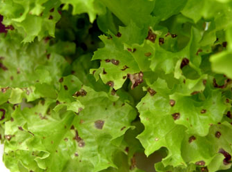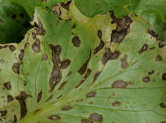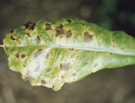 ◦ 잎에 처음에는 수침상의 작은 반점으로 나타나고 진전되면 암갈색의 부정형 반점으로 확대됨